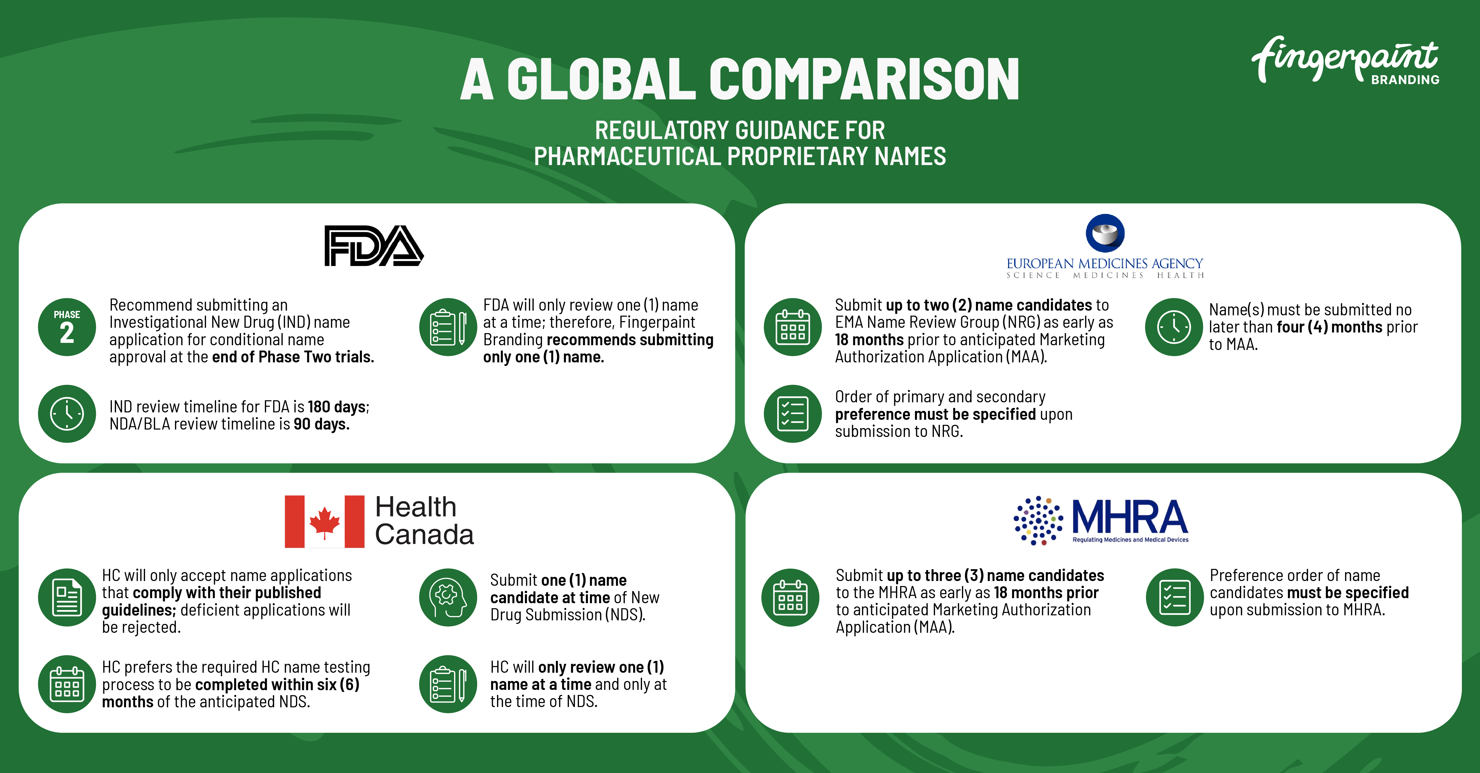 Based on recent guidance from major health agencies, here is a breakdown of how the name approval process differs across the U.S., Europe, the UK, and Canada.